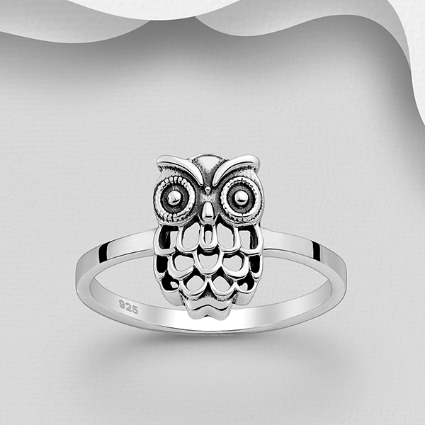 Bague Chouette en argent massif 92.5. Largeur motif 12 mm.