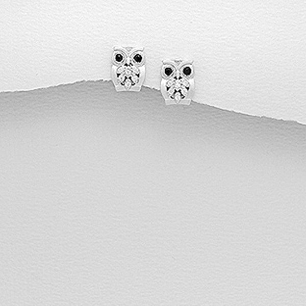 Boucles d’oreilles chouette en argent 92.5 rhodié et zirconium. Dimensions 8 x 10 mm