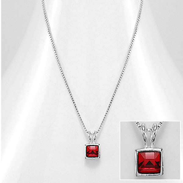 Collier en argent 92.5 et pendentif en cristal Swarovski Light Siam. Dimensions chaîne : 41.25 cm jusqu’à 45 cm, pendentif 5 mm x 10 mm