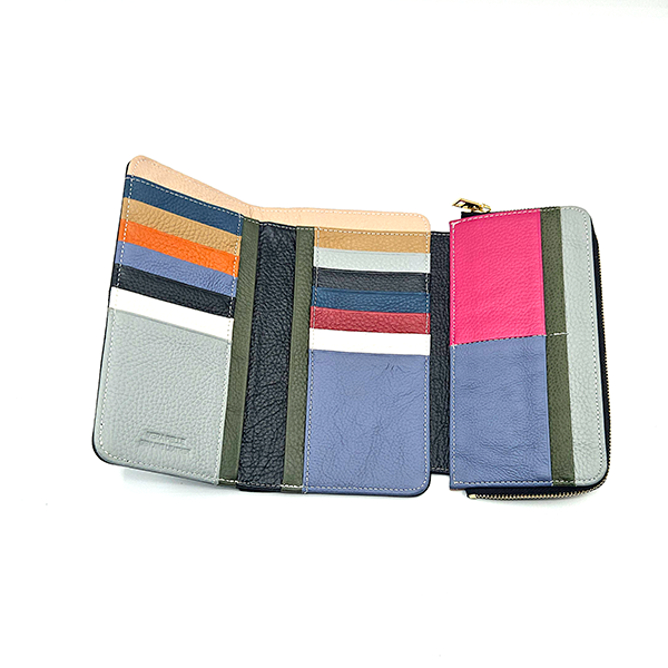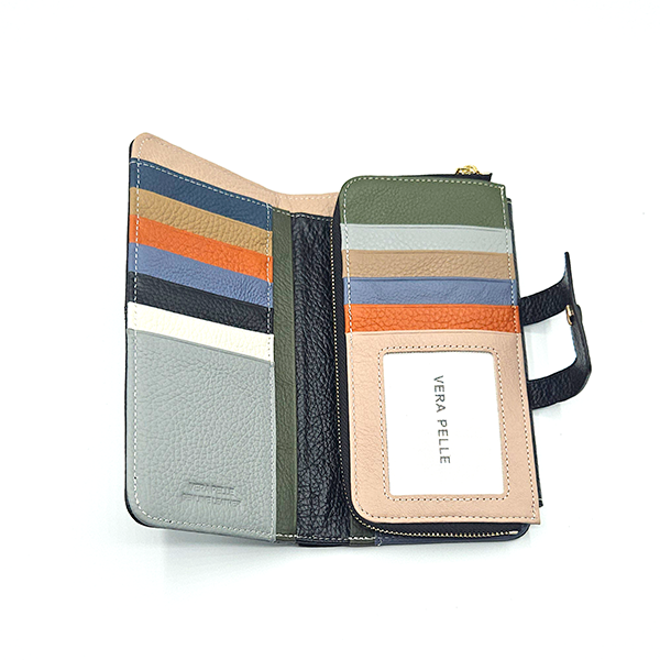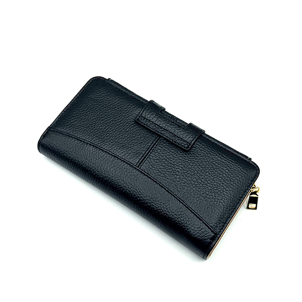 Portefeuille porte-cartes Noir en cuir, fermeture du portemonnaie par zip, un triple compartiment pour papier et CB, fermeture par rabat à bouton pression